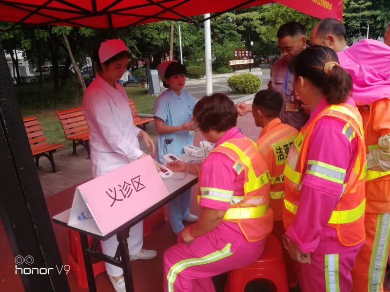 10月15日下午,第十五支部两名党员陈晓霞、黎金凤参与“关爱城市美容师,共享光明烙画美”活动。她们为清洁工进行义诊,免费测量血压,为他们普及高血压、糖尿病相关健康知识。(通讯员 陈凤娟)