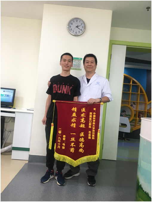 10月22日,第七党支部党员、口腔科石志强医生收到患者马先生赠送的锦旗。1年以前,马先生因牙列不齐看了好几家医院,医生们都觉得矫正难度大、治疗效果不好,委婉拒绝治疗。听说澳博娱乐口腔科为深圳市“三名工程”,特意来到澳博娱乐。石医生经过详细检查,给患者设计系列治疗方案,经过一年多时间精心治疗,矫治效果很好,患者非常满意,特送来锦旗表示感谢。(通讯员 唐世平)
