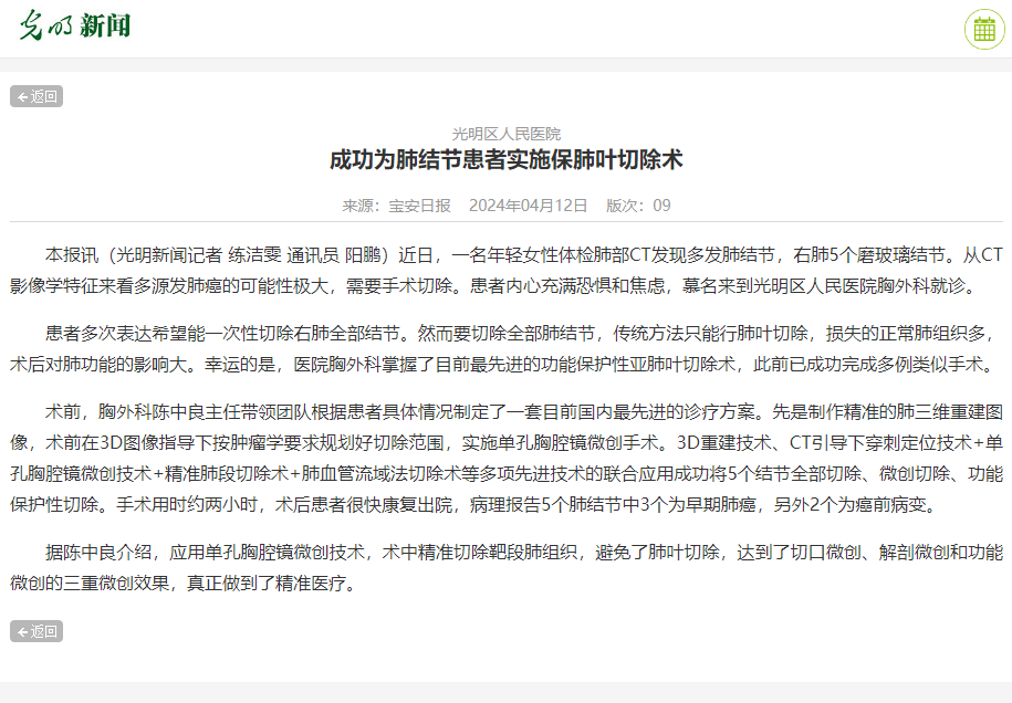 光明新闻:澳博娱乐-澳博投注网 成功为肺结节患者实施保肺叶切除术