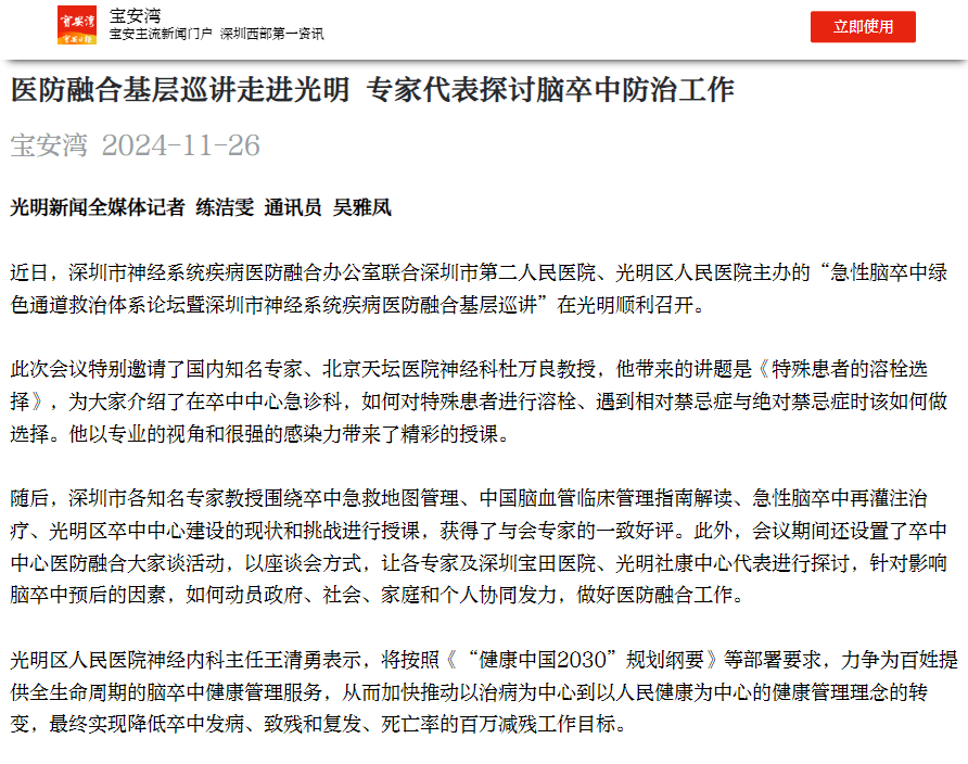 宝安湾:医防融合基层巡讲走进光明 专家代表探讨脑卒中防治工作